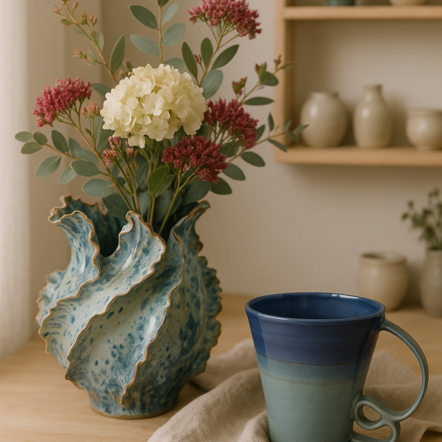 Mes créations, utilitaires ou décoratives, invitent à un voyage sensoriel où chaque pièce raconte une histoire. Elles sont caractérisées par leur élégance et leur raffinement. Je privilégie les formes épurées, les textures délicates et les couleurs qui apaisent et inspirent, avec une dominance de bleu.