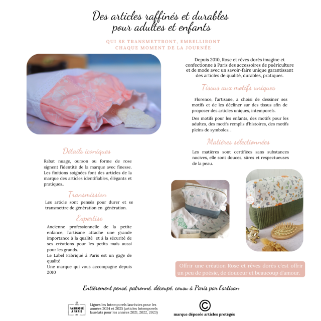Distinguée par le Label Fabriqué à Paris pour sa ligne les Intemporels exclusifs, Rose et rêves dorés s'adresse à celles et ceux qui recherchent des créations douces, durables et élégantes, pensées pour être transmises de génération en génération.