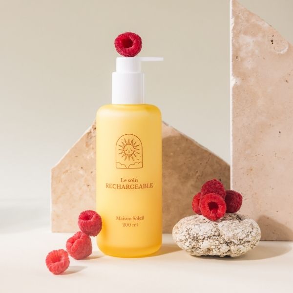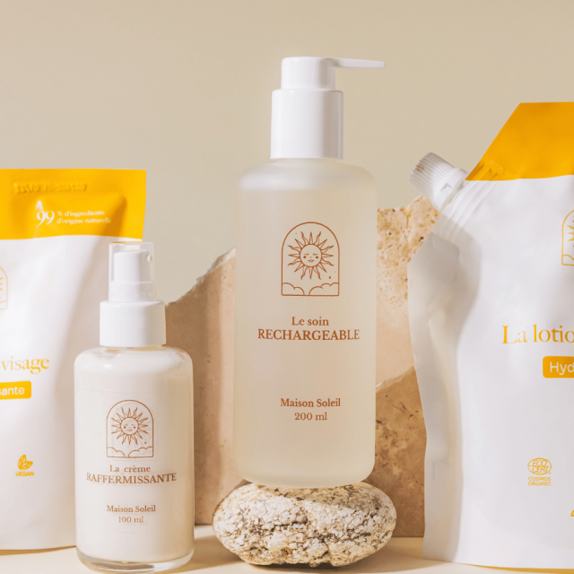 Maison Soleil propose une gamme complète de soins cosmétiques bio, rechargeables et pensés pour toute la famille : Hygiène quotidienne : gel lavant doux, shampoing doux Soins visage : crèmes hydratante et raffermissante, lotion micellaire, lotion tonique hydratante Soins corps : lait hydratant, huile sèche nourrissante Nos formules sont certifiées BIO et vegan, fabriquées en France avec des partenaires locaux (Lorraine, Vosges, Alsace). Les flacons en verre renforcé, réutilisables et élégants, s’accompagnent de recharges grands formats afin de réduire durablement l’usage du plastique. Maison Soleil allie efficacité, naturalité et élégance durable pour offrir des rituels quotidiens respectueux de la peau et de la planète.